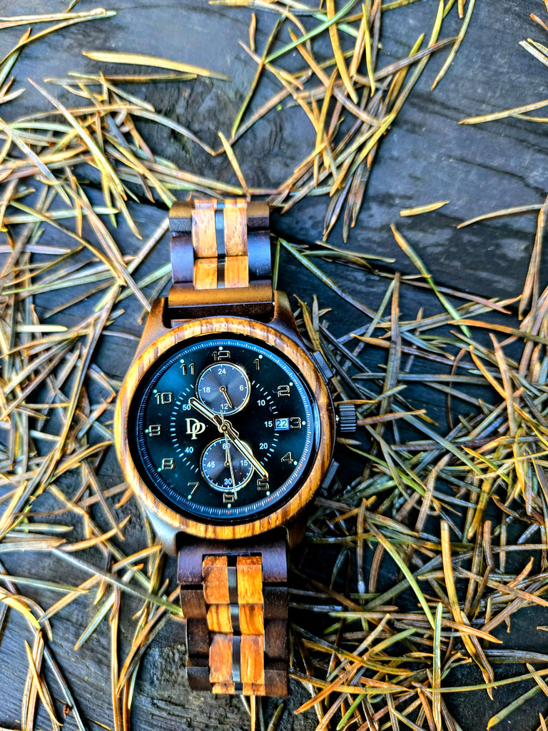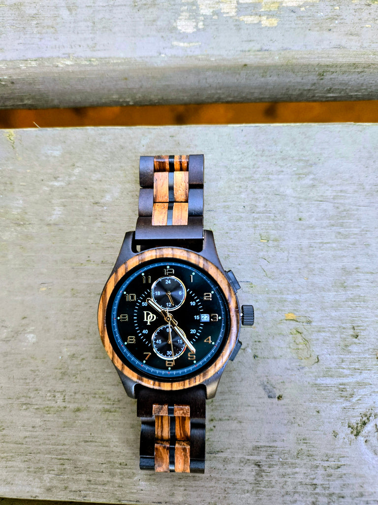 Meet your new everyday statement piece, a bold, modern wood watch for men designed to stand out without trying too hard. This wooden chronograph watch pairs ebony and zebrawood textures to reflect the beautiful nature around us. It blends these natural wood tones with a clean black dial for a premium look you can dress up or wear casually. Shockingly lightweight!